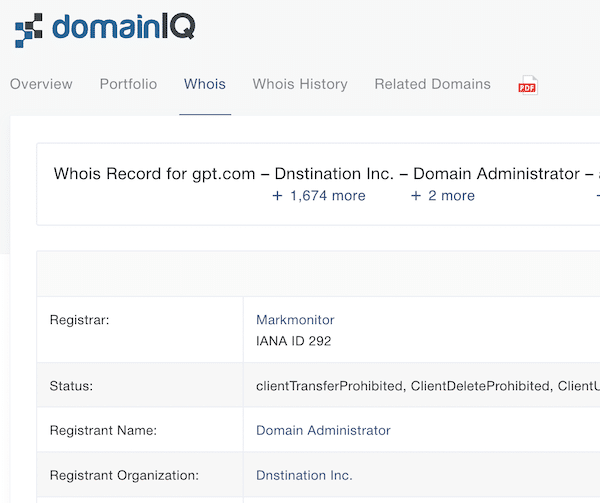 GPT.com is now registered to DNStination Inc. at corporate domain registrar, MarkMonitor. DNStination is the MarkMonitor Whois privacy service. This means I can’t conclusively say the domain name is owned by OpenAI, but it would be peculiar for a MarkMonitor client to acquire a domain name like this and forward it to another company’s website. Both Chat.com and OpenAI.com are also registered at MarkMonitor, but neither of those domain names use Whois privacy.