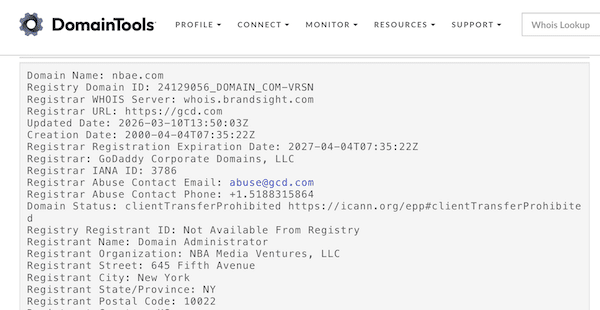 Whois records at DomainTools show the NBAE.com domain name is registered to the NBA via GoDaddy Corporate Domains.