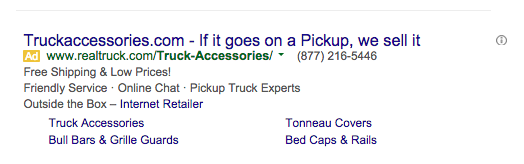 Interesting to set up an Adwords account like this because it makes you look like the big player in that space when you are just using the name to gain eyeballs. No worries about trademark infringement by using a category killer in your ad because it’s just a set of words plus the Truckaccessories.com domain isn’t a real business so Google won’t penalize them.